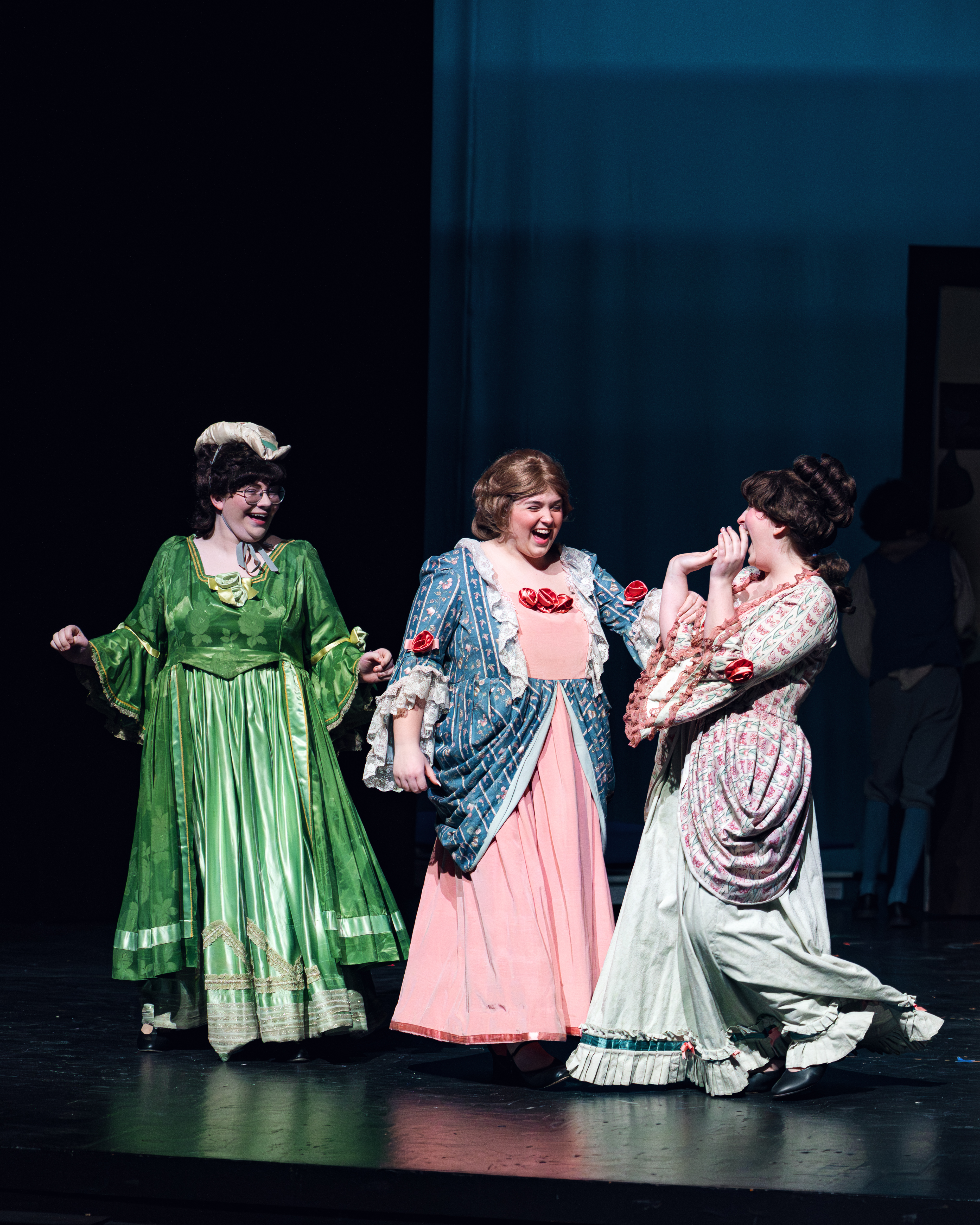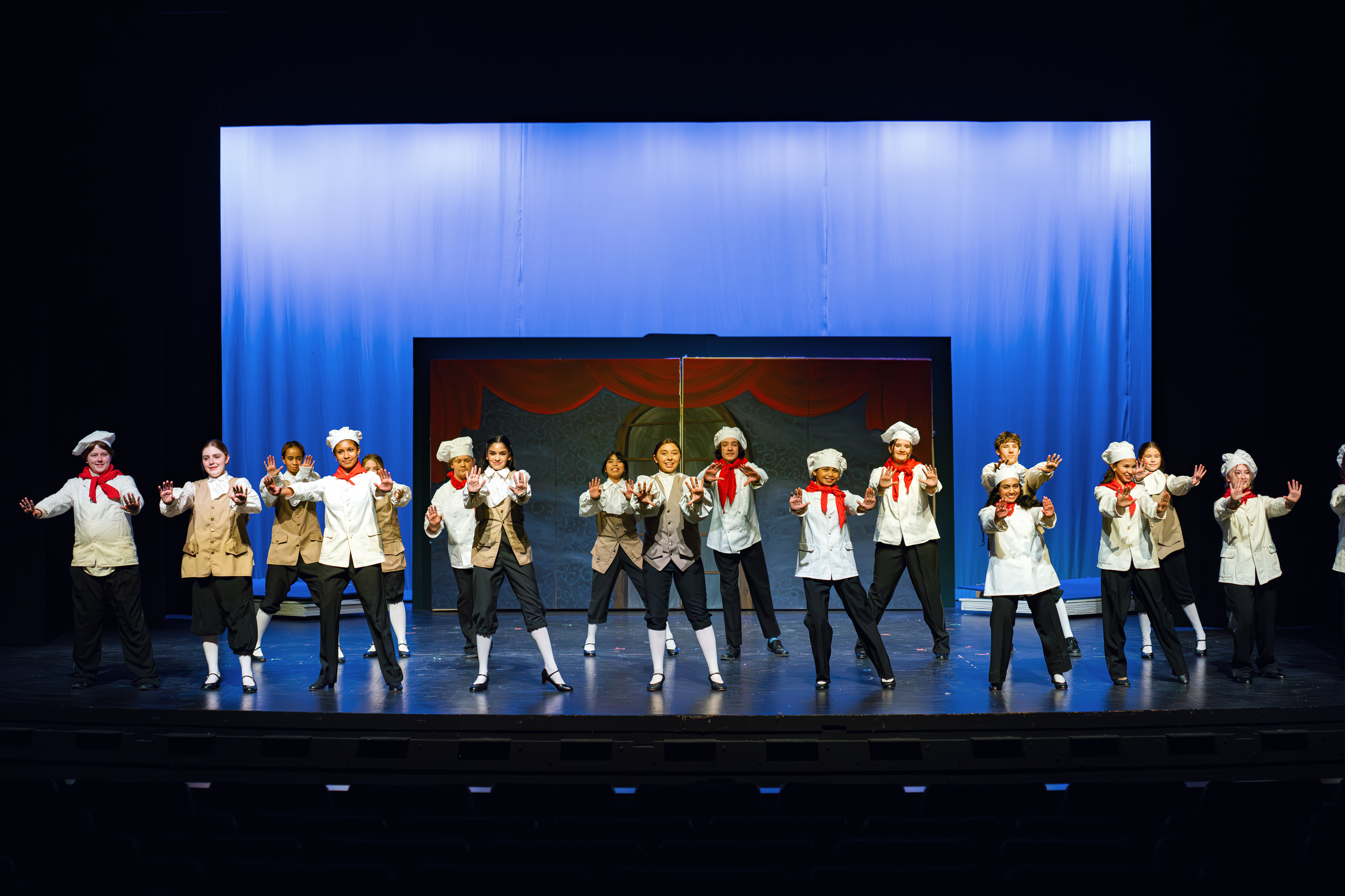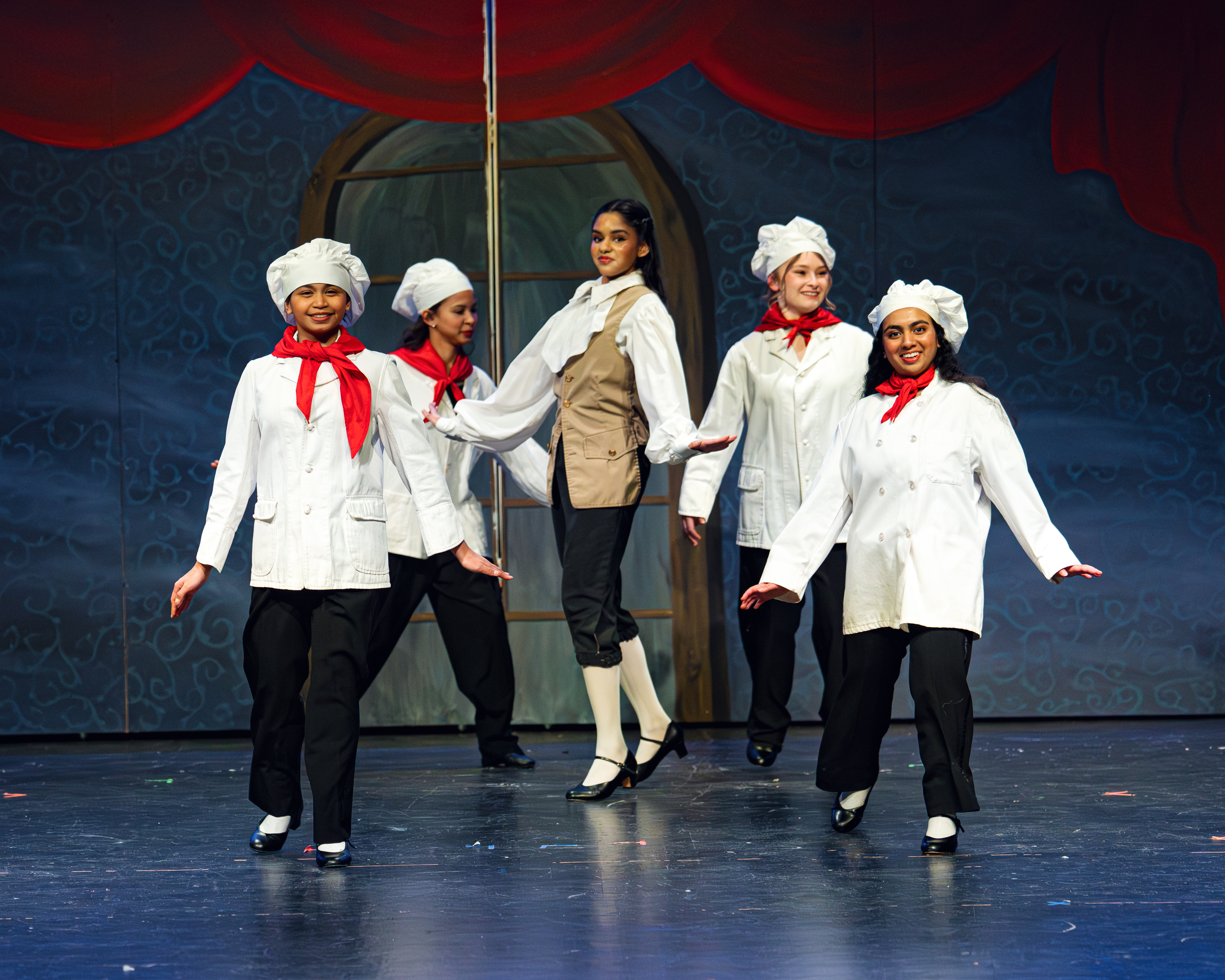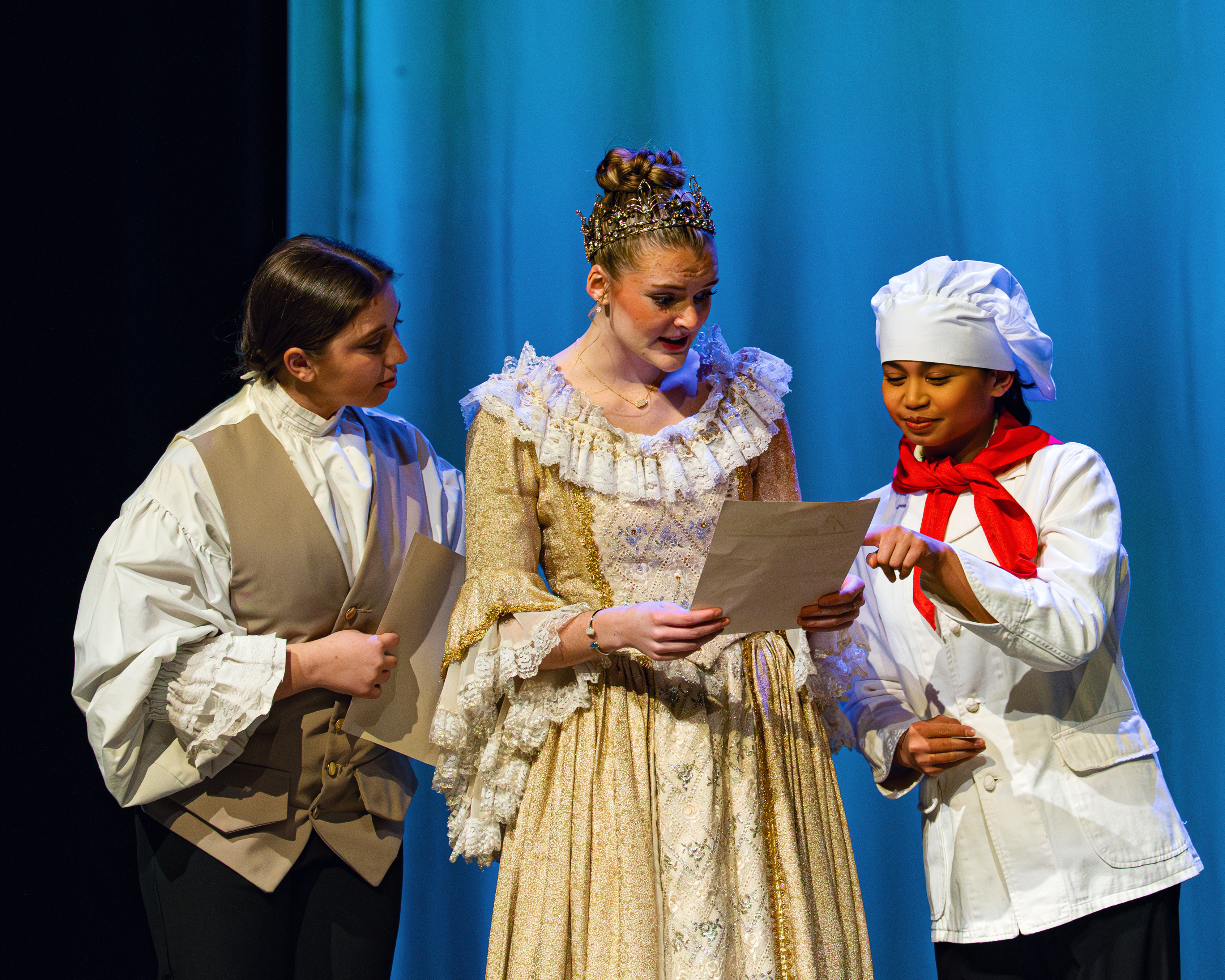Gianna Scalzo (as the Steward), Ella Pederson (as the Queen), and Zabella Marley Mejos (as the Cook)